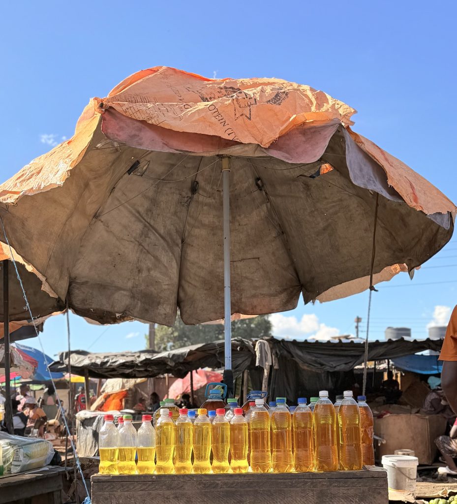 Bottles of locally produced and rebottled cooking oil on display at a market stall in Mbare, one of Zimbabwe’s busiest trading hubs, where affordability shapes. Photography: Getrude Chigerwe/ Imara Communications